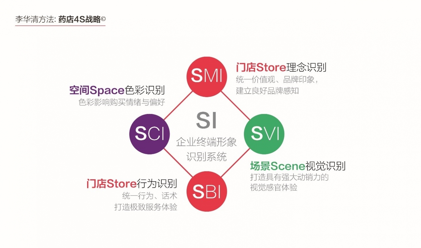為此,我們依據品牌感知層和體驗層為原則,在一心堂集團CI基礎上分化出獨立的藥店4S戰略體系,4S戰略完全區隔于藥店傳統的SI空間設計體系,而是涵蓋了藥店的文化、品牌、體驗、營銷四大維度的整合戰略策劃。